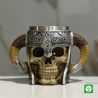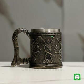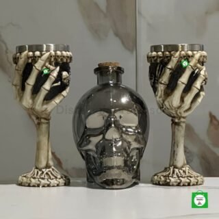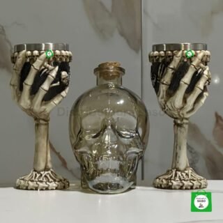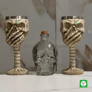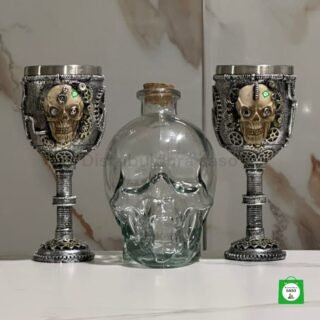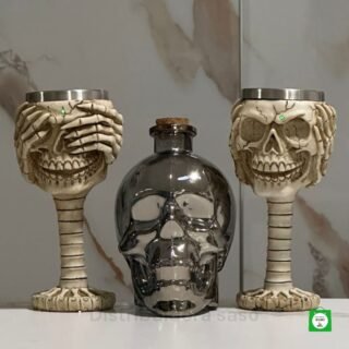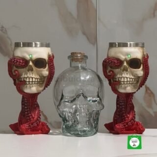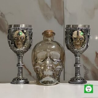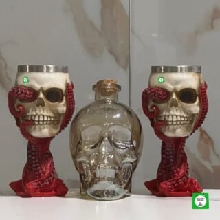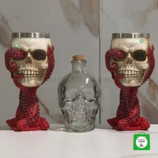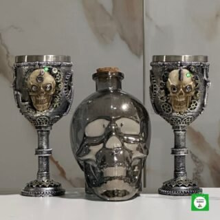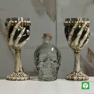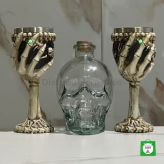 licorera de calavera de 400ml transparente mas 2 copas de vino metalicas con diseño de calavera