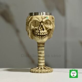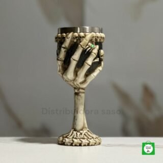 copa de vino metalica con diseño de calavera y mano de esqueleto