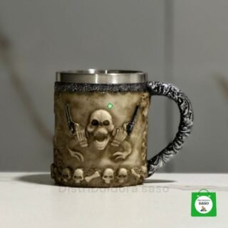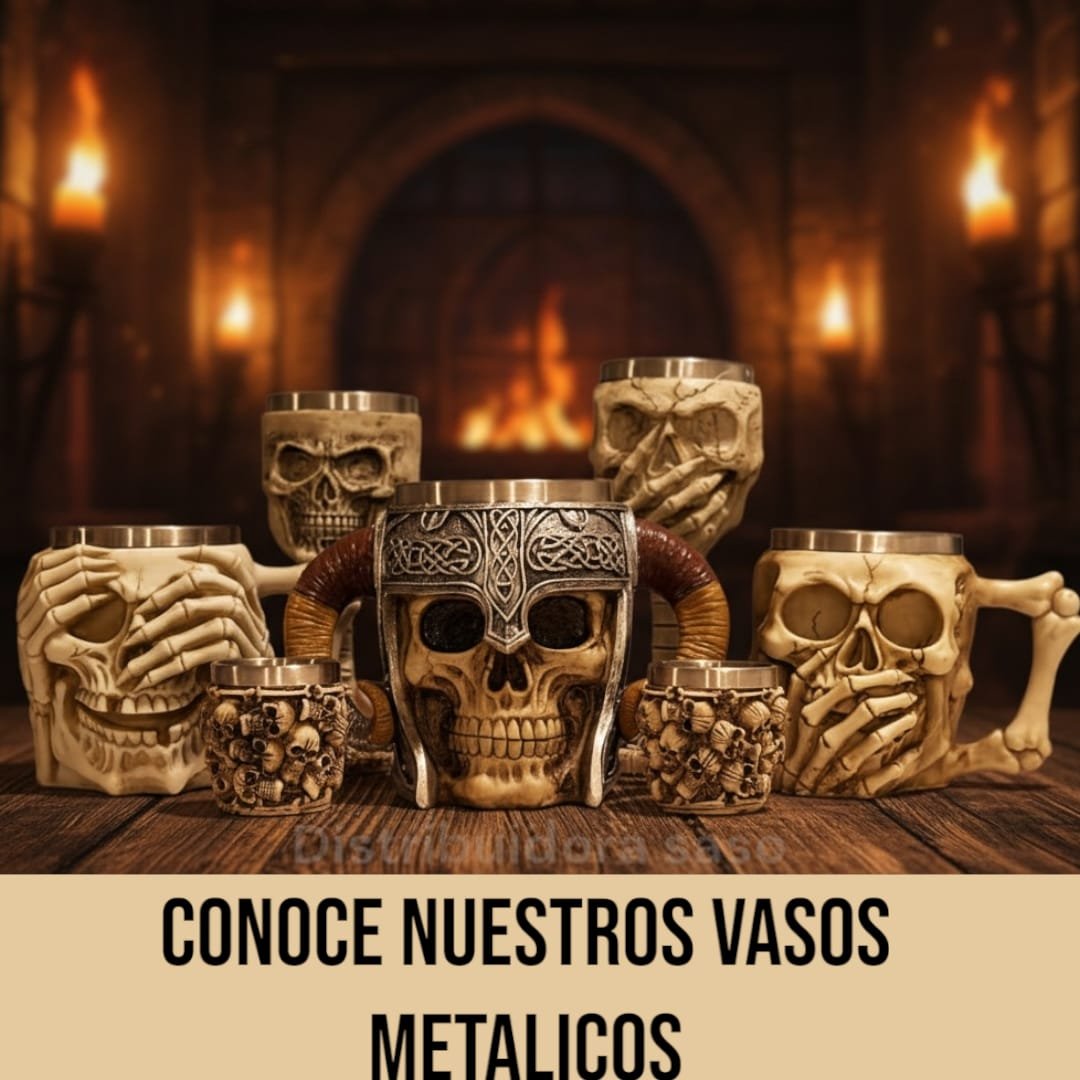 licorera de calavera de 750ml transparente mas 2 copas de vino metalicas con diseño de calavera