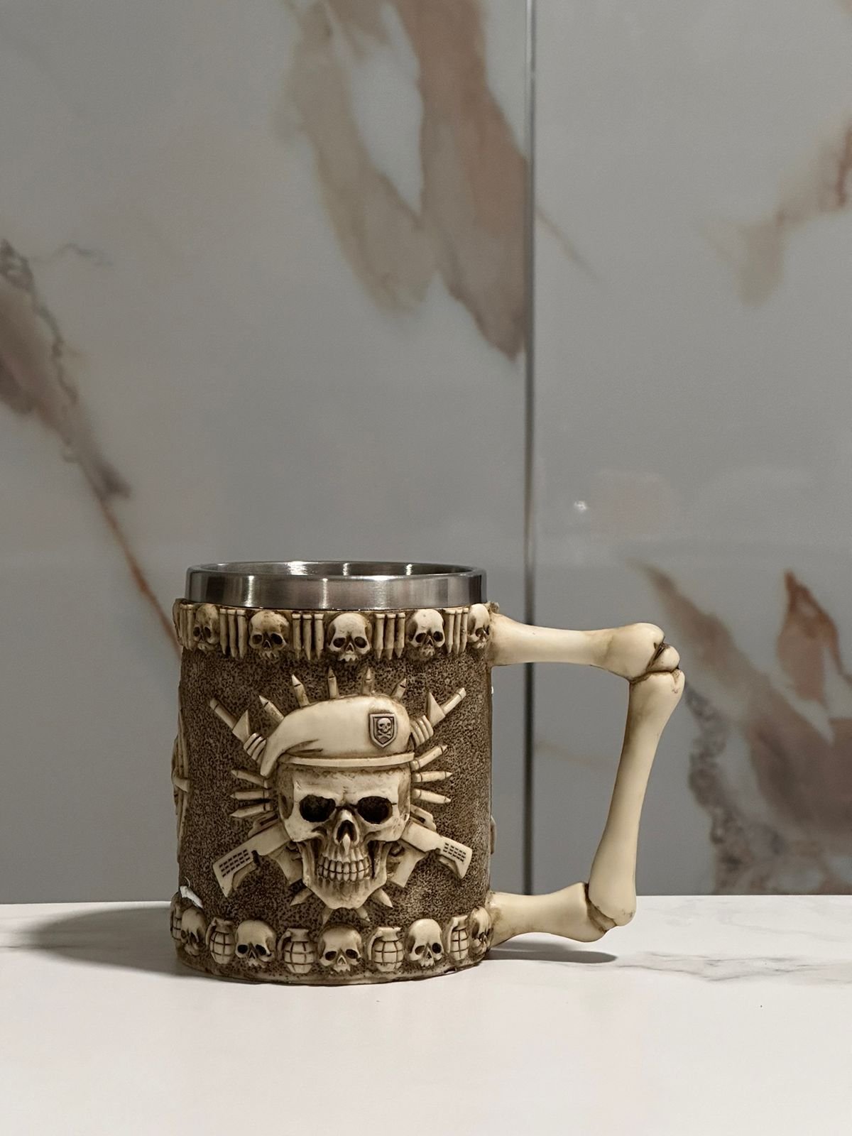 Llevaba tiempo buscando algo así y cuando lo vi supe que era el indicado. El diseño de calavera guerrera está grabado con un nivel de detalle impresionante, cada línea se siente trabajada. El metal es grueso y resistente, nada que ver con los vasos genéricos del mercado. Para los amantes del estilo warrior gothic es simplemente perfecto 💀⚔️