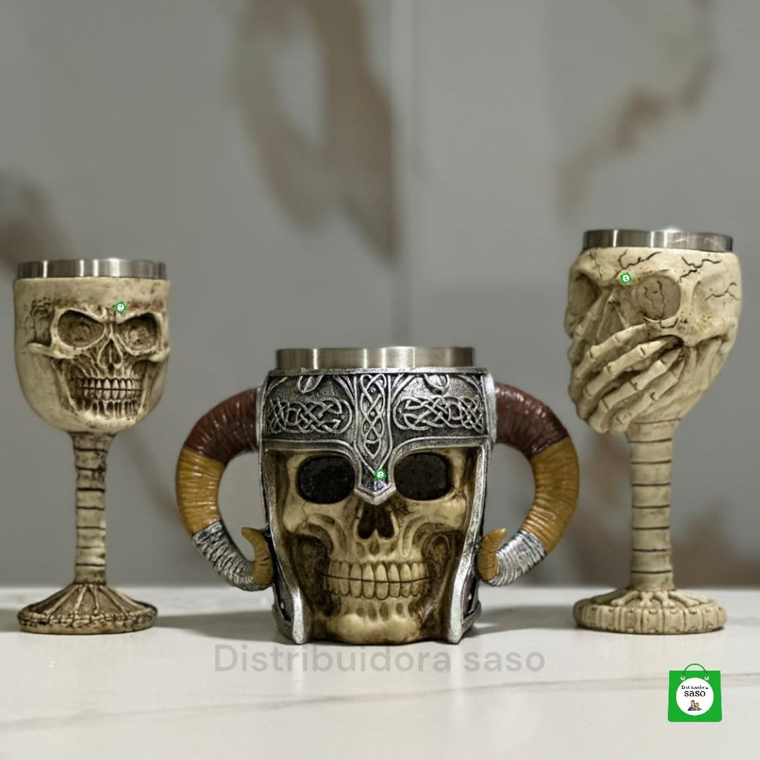 combo de vasos metalicos de calavera con diseño vikingo y diseño exoticoLeer más