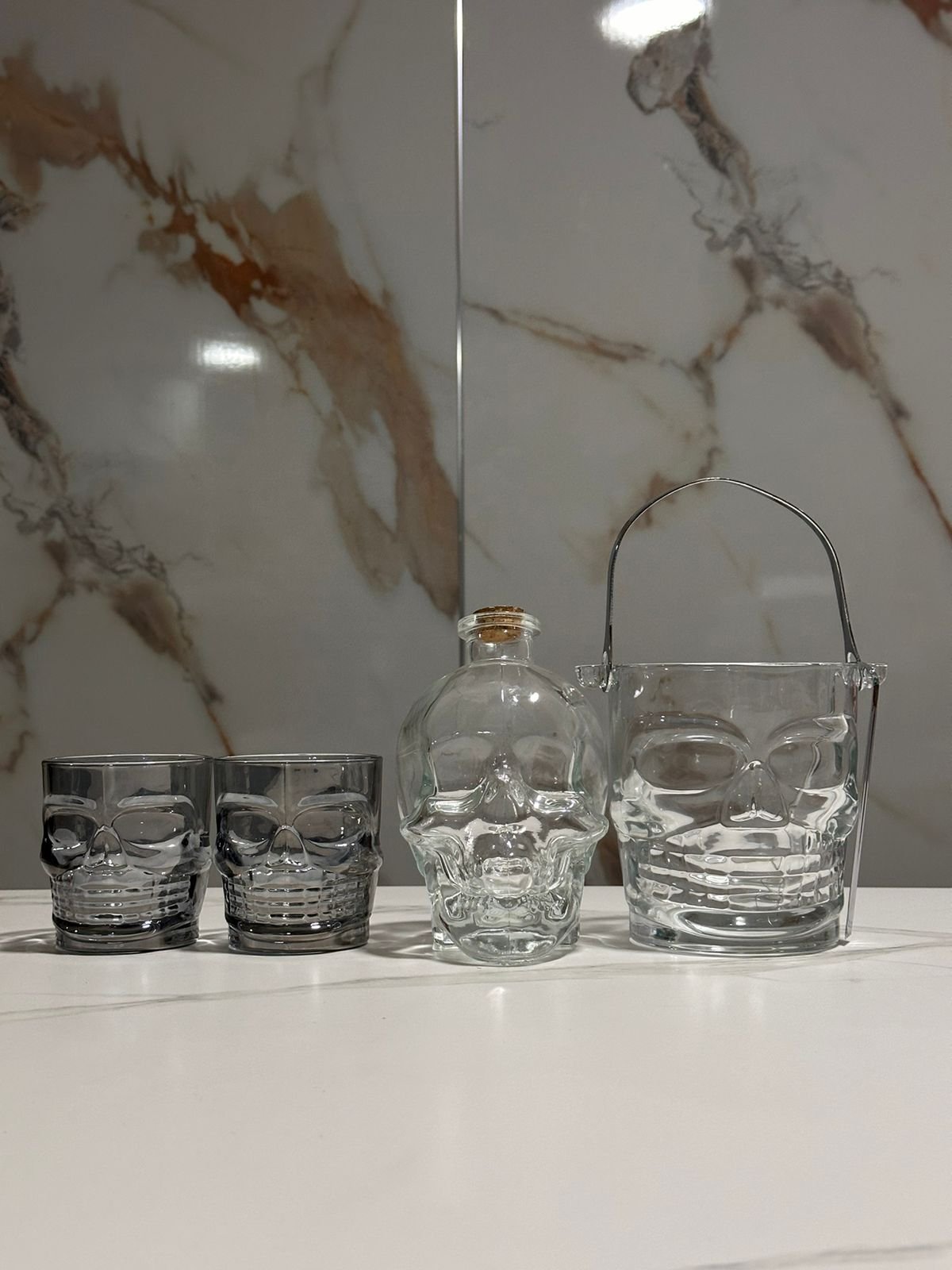 licorera de 750ml de calavera mas hielera de calavera mas 2 vasos whiskeros de calavera de color negro