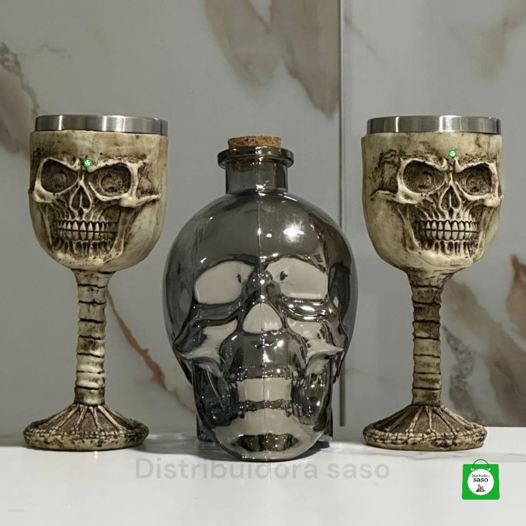 licorera de calavera de 750ml color negro mas 2 copas de vino metalicas con diseño de calavera